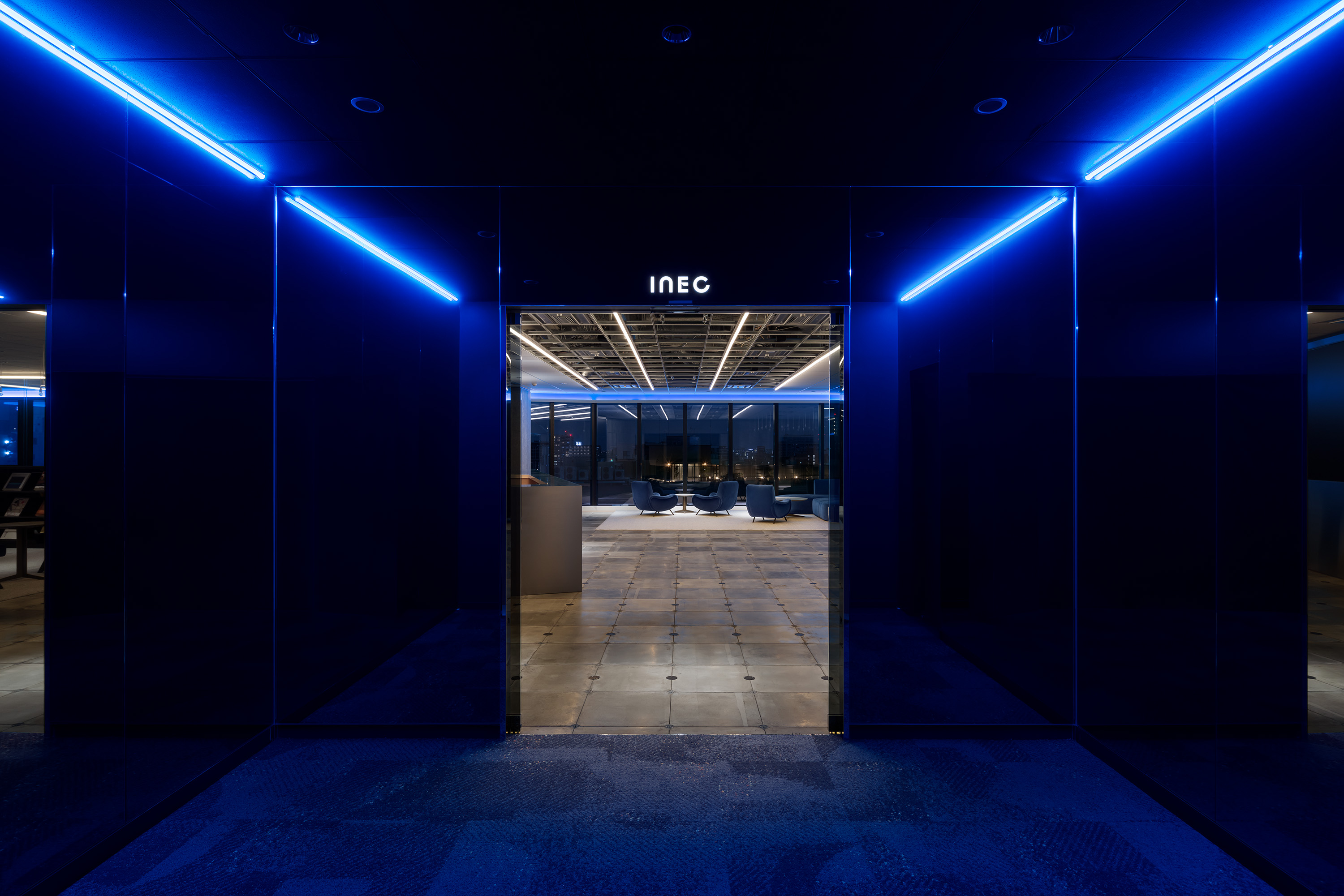 ブランドカラーのブルーが来訪者を誘い、光と音のインスタレーションでアイネックのフィロソフィーを表現。